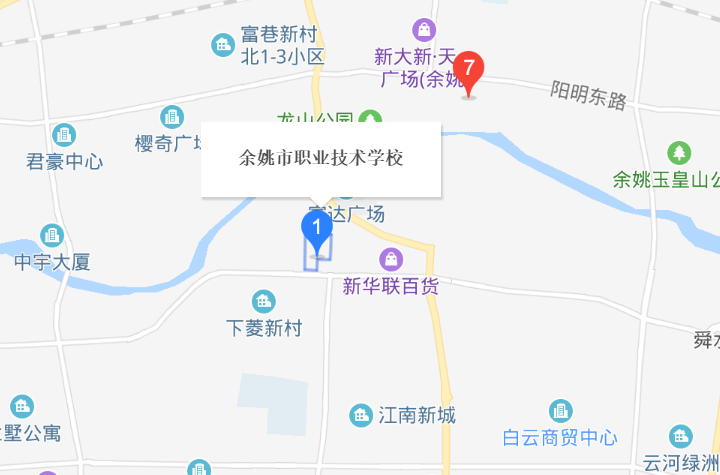 余姚市职业技术学校地址:余姚市新西门路28号。学校地处余姚城区中心,占地面积101亩(67367m²),建筑面积34490m²。分新西门和丰南两个校区。学校拥有总价值超过1500万元的一流的设施设备。余姚市职业技术学校地址余姚市职业技术学校是浙江省重点中等职业中学,宁波市现代建设达纲学校,宁波市文明单位。1989年宁波大学初等教育分院在我校设立教学点,1998年5月经宁波市政府...
