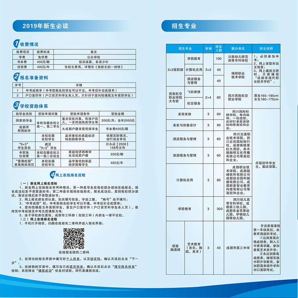 成都市现代职业技术学校招生条件、招生分数、招生要求;初中毕业生,五官端正,身体健康,无色盲无色弱传染性疾病等。学校设立了美容美发部、信息部、旅游部、学前教育部、国际升学部,开设了计算机、飞机维修、航空服务、旅游服务与管理、学前教育、美容美体、美发与形象设计等特色专业。成都市现代职业技术学校是成都市锦江区直属公办学校、国家中等职业教育改革发展示范校、四川省“校风示范校”、四川省“内务管理示范校”、国...